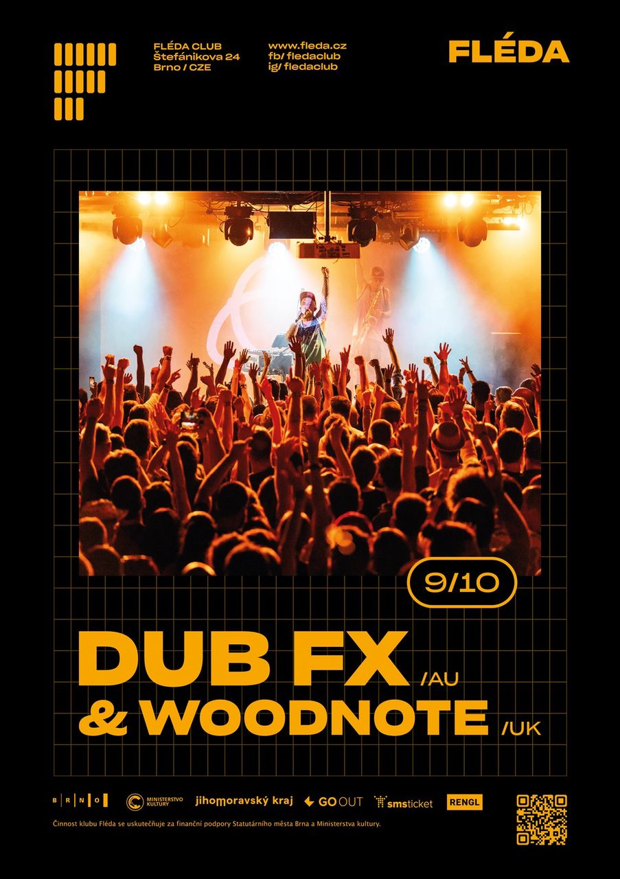Australský rodák vystupující pod pseudonymem Dub FX se už poněkolikáté vrací do České republiky, po vystoupení na festivalech Colours of Ostrava nebo Rock for People se i se svou esenciální loop station objeví 9. října v brněnském klubu Fléda. Tento všestranný umělec, který před svou úspěšnou sólovou kariérou působil v několika kapelách různých žánrů a sám pak buskoval po celé Evropě, dorazí se saxofonistou Woodnotem a představí výběr ze svých několika desek včetně nejnovějších singlů z připravovaného alba.