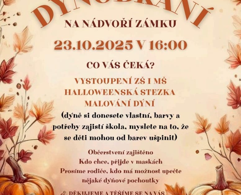Nádvoří Bohutického zámečku zaplní nejrůznější dýňové výtvory i vůně dýňové polévky. Akce pro děti nabídne malování dýní či Halloweenskou stezku. Během odpoledne proběhne i vystoupení dětí z místní MŠ a ZŠ a připraveno bude pro účastníky i drobné občerstvení.