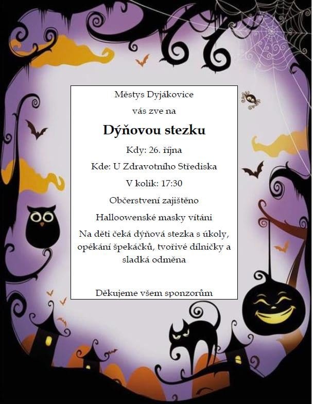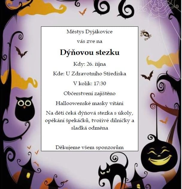 Zábavná dýňová stezka v Dyjákovicích pro malé i velké, s úkoly, opékáním špekáčků i tvořivými úkoly, odstartuje po setmění v 17:30 hod. u Zdravotního střediska.