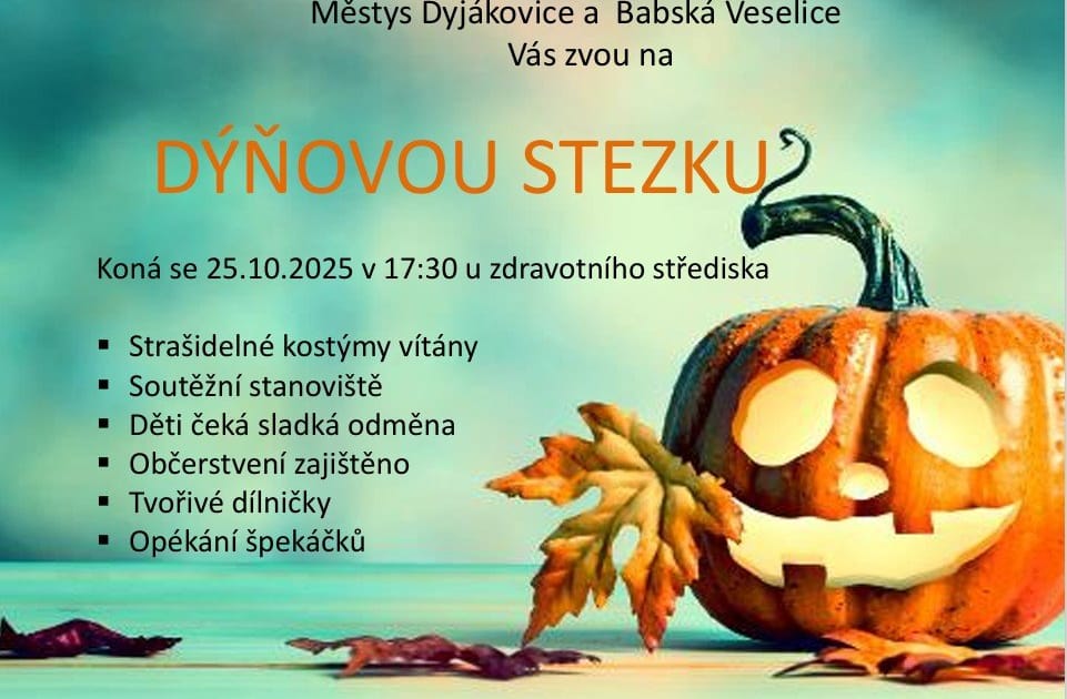 Zábavná dýňová stezka v Dyjákovicích pro malé i velké, s úkoly, opékáním špekáčků i tvořivými úkoly, odstartuje po setmění v 17:30 hod. u Zdravotního střediska.