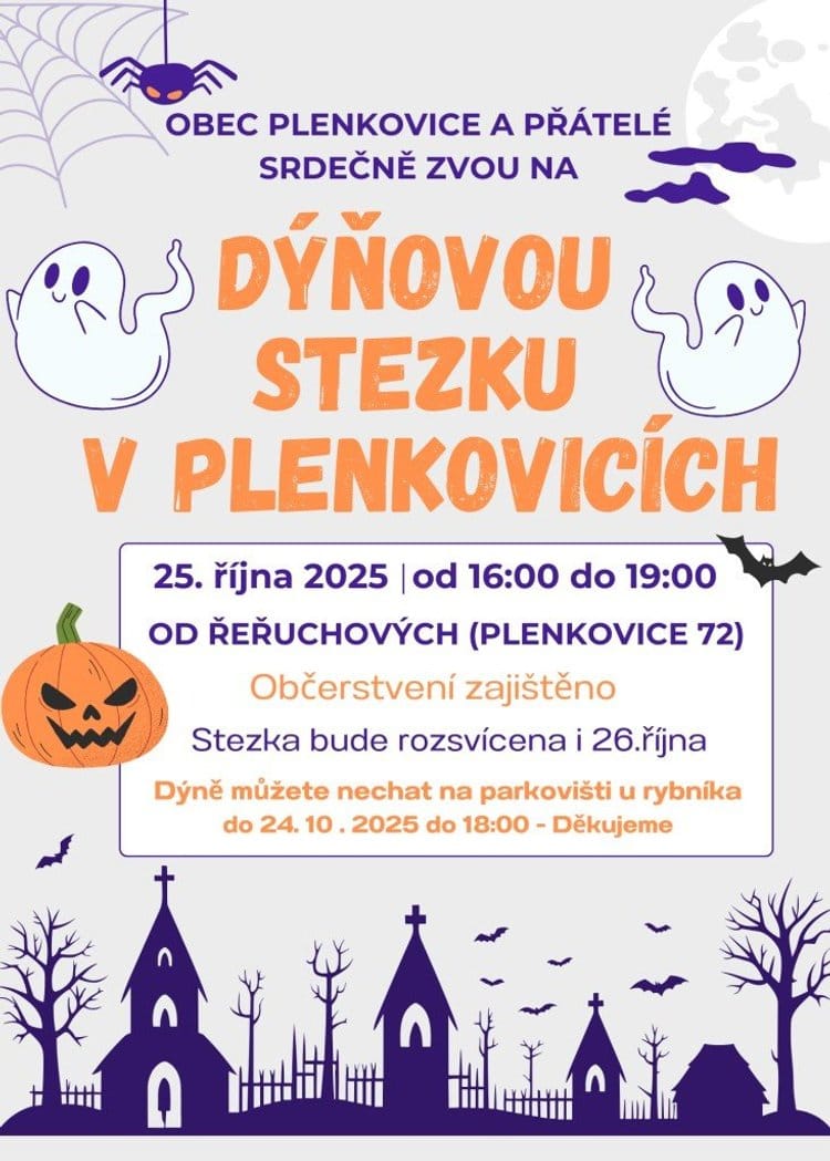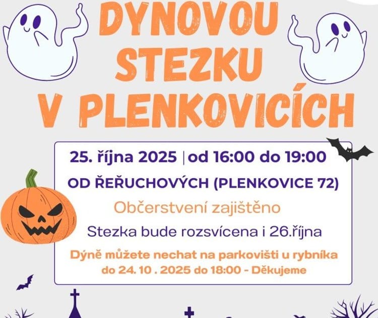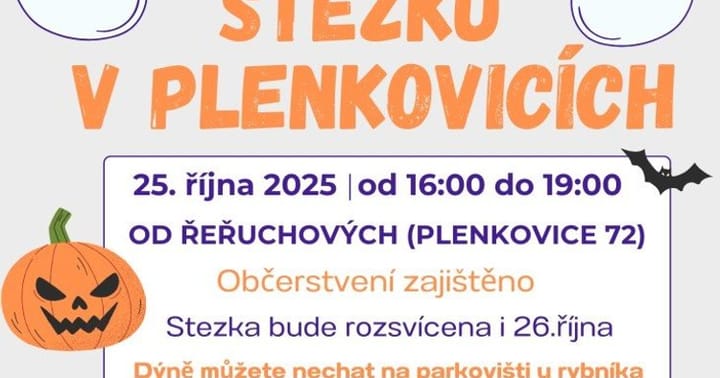 Na trochu strašidelnou Dýňovou stezku se můžete s dětmi vypravit také do Plenkovic. Startuje se v 16 hod. Pro zájemce bude stezka rozsvícena i následující den.