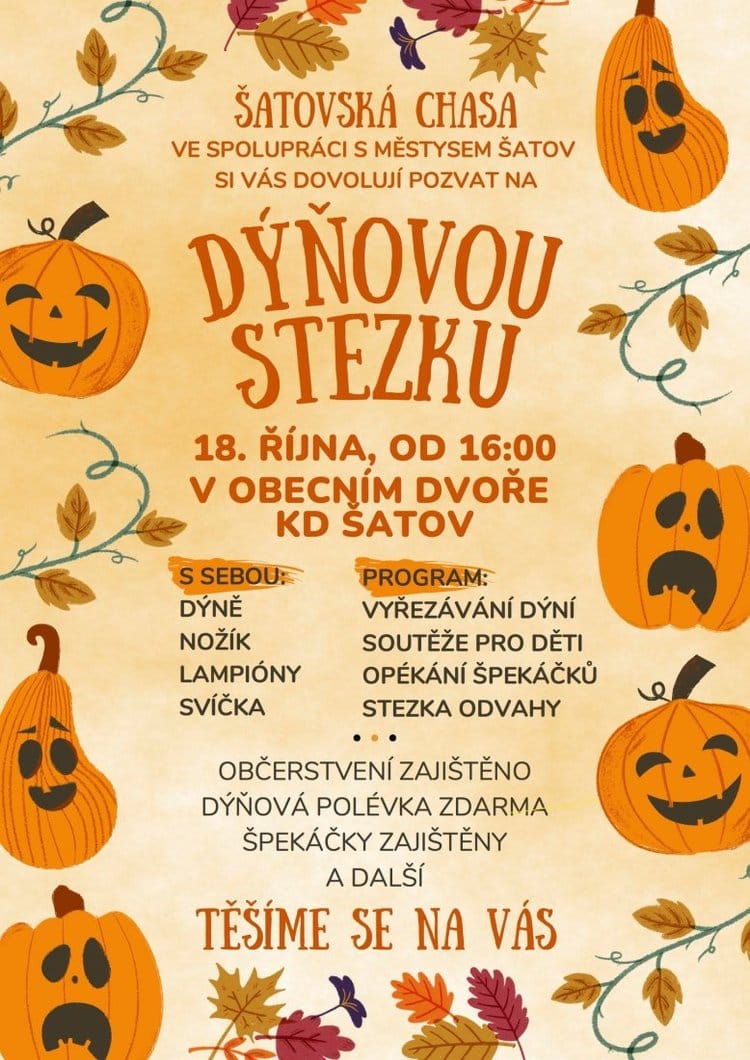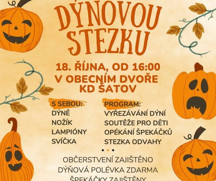 Tak trochu strašidelná Dýňová stezka kombinovaná s lampionovým průvodem se uskuteční třetí říjnovou sobotu v Šatově. Start je v 16:00 hod. v obecním dvoře Kulturního domu v Šatově. Čeká na vás opékání špekáčků, dýňová polévka i soutěže pro děti.
