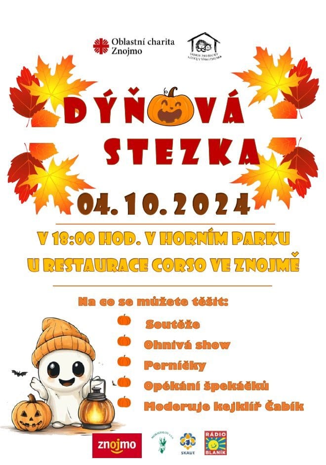 V podzimních dnech se ve Znojmě tradičně koná Dýňová stezka pro děti i jejich rodiče. Každoročně ji organizuje Oblastní charita Znojmo, které pomáhají s přípravou soutěžních stanovišť znojemští Skauti. Akce začíná v 18 hod. a končí ve 20 hod., ale můžete přijít kdykoliv v průběhu večera, aby se u stanovišť netvořily fronty.