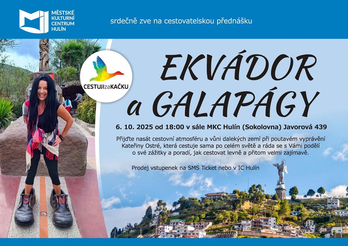 Městské kulturní centrum Hulín Vás srdečně zve na cestovatelskou přednášku EKVÁDOR a GALAPÁGY, která se uskuteční 6. 10. 2025 od 18:00 v sále MKC Hulín (Sokolovna Javorová 439).