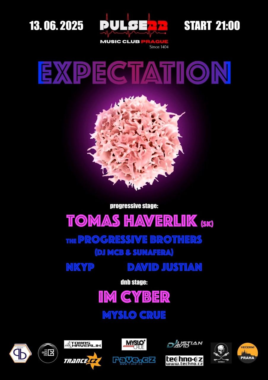 V pátek 13. 6. od 21:00 hodin se bude konat premiérové vydání párty Expectatation v pražském klubu Pulse 22. Dvě parádní stage s našlapaným lineupem jsou zárukou kvalitního mejdanu a máte se na co těšit. Hlavní prostor ovládne sound ve stylu progressive & melodic house a jsme opravdu velmi rádi, že pozvání přijala slovenská legenda TOMAS HAVERLIK. Nezávislý kreativní umělec, skvělý producent s neuvěřitelným výběrem skladeb, známý též z projektu Tkac & Haverlik, se po delší době vrací do Prahy a věřte, že jeho hudební příběh bezesporu splňuje slogan – the best progressive sound from Slovakia. Dále zde vystoupí oblíbený pražský matador Nkyp, tentokrát v houseovém setu, zlínská dvojka, která celý koncept připravuje – the Progressive Brothers ve složení DJ MCB & Sunafera a David Justian, jenž byl v minulosti u zrodu párty Expectation.