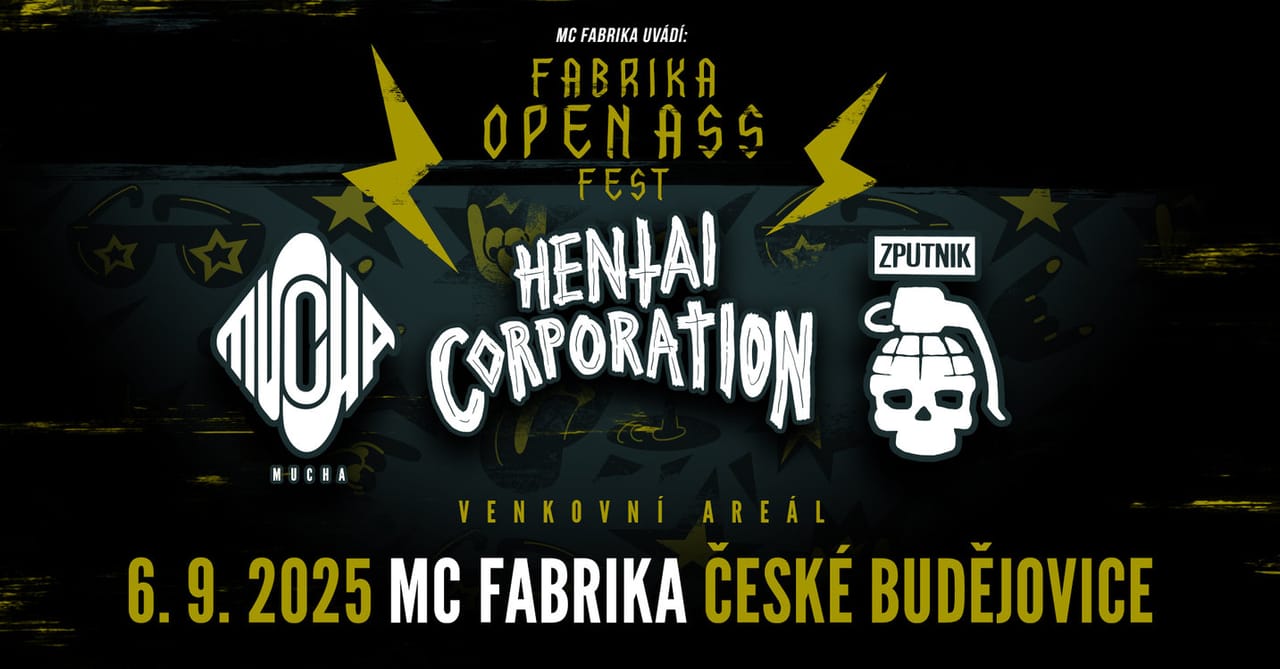 Spojením tří neotřelých, drzích, nekonvenčních a naprosto geniálních hudebních těles Hentai Corporation, Mucha a Zputnik vzniká nový festival FABRIKA ASS FEST, který proběhne v sobotu 6.9. na našem venkovním areálu, pod širým nebem. Tohle si nemůžeš nechat ujít!
