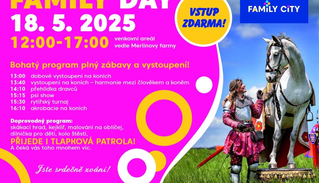 Rozlehlý obchodně-zábavní areál Family City a obří Merlinův dětský svět zvou na jedinečný rodinný festival. Od 12 do 17 hod. se těšte na rytířské turnaje, akrobacii a vystoupení na koních, psí show, sokolnickou ukázku dravců, ale také na další doprovodný program, ve kterém nebude chybět kejklíř, skákací hrad, malování na obličej, kreativní dílničky pro děti nebo výherní kolo štěstí. Malé děti určitě potěší Tlapkova patrola i kouzelník Merlin. Zajištěno bude také občerstvení. Vstup na akci je zcela zdarma!