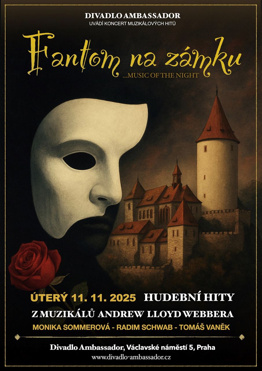 V úterý 11.11.2025 zazní od 20:00 v novém Divadle Ambassador hity písní od světoznámého britského hudebního skladatele Andrew Lloyd Webbera – autora The Phantom of the Opera v podání hlavních představitelů české verze muzikálu Fantom opery.