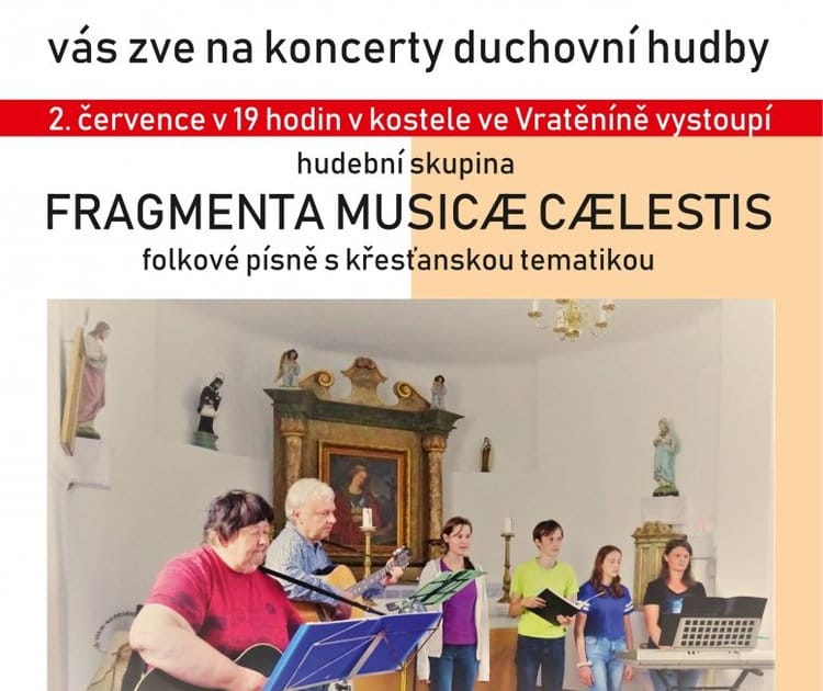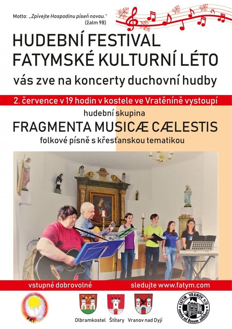 V rámci série duchovních koncertů nazvaných „Fatymské kulturní léto“ vystoupí v kostele sv. Jakuba Většího ve Vratěníně hudební skupina Fragmenta Musicae Caelestis. Přijďte si poslechnout folkové písně s křesťanskou tematikou. Začátek v 19 hod. Vstupné dobrovolné.