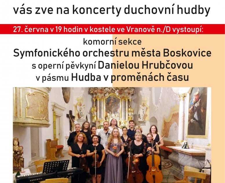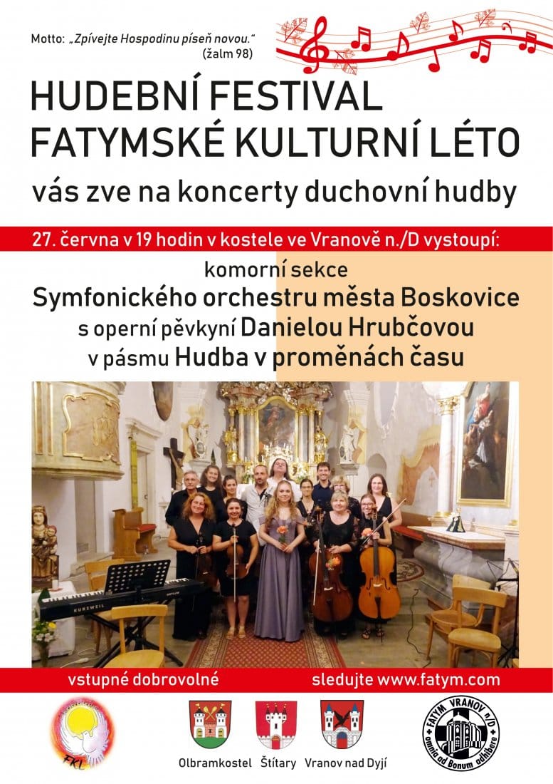 V rámci série duchovních koncertů nazvaných „Fatymské kulturní léto“ vystoupí v kostele Nanebevzetí Panny Marie ve Vranově nad Dyjí komorní sekce Symfonického orchestru města Boskovice společně s opěrní pěvkyní Danielou Hrubčovou. Hudební program nazvaný „Hudba v proměnách času“ začíná v 19. hodin. Vstupné dobrovolné.