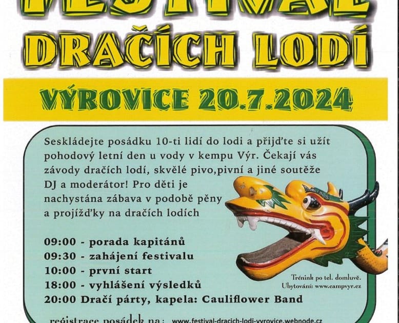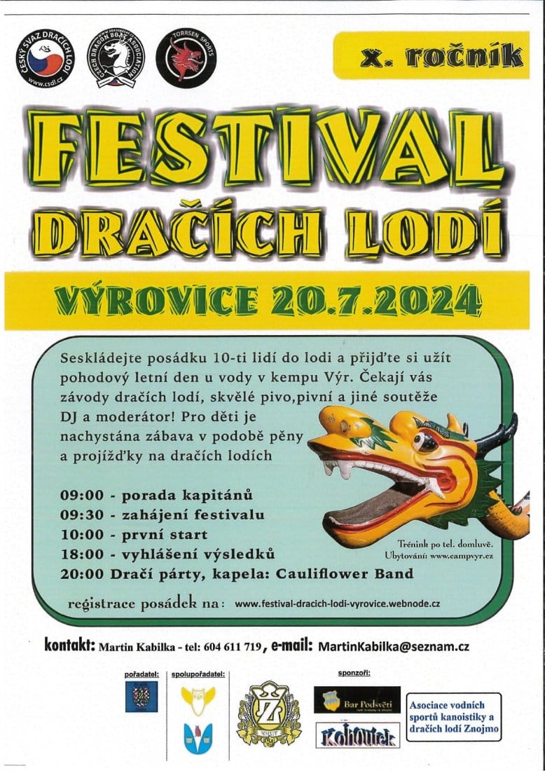 Už 10. ročník závodu dračích lodí s 10člennou posádkou se pojede na Výrovické přehradě 20. července. Program zahájí už v 9 hod. porada kapitánů, v 10 hod. odstartují první posádky a vyhlášení výsledků je naplánováno na 18 hod. Večer pak od 20 hod. naváže Dračí zábava s živou muzikou.