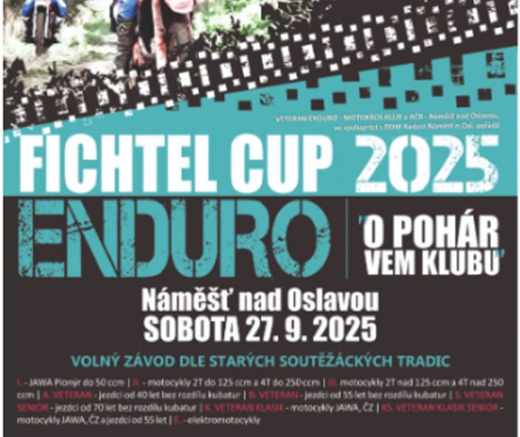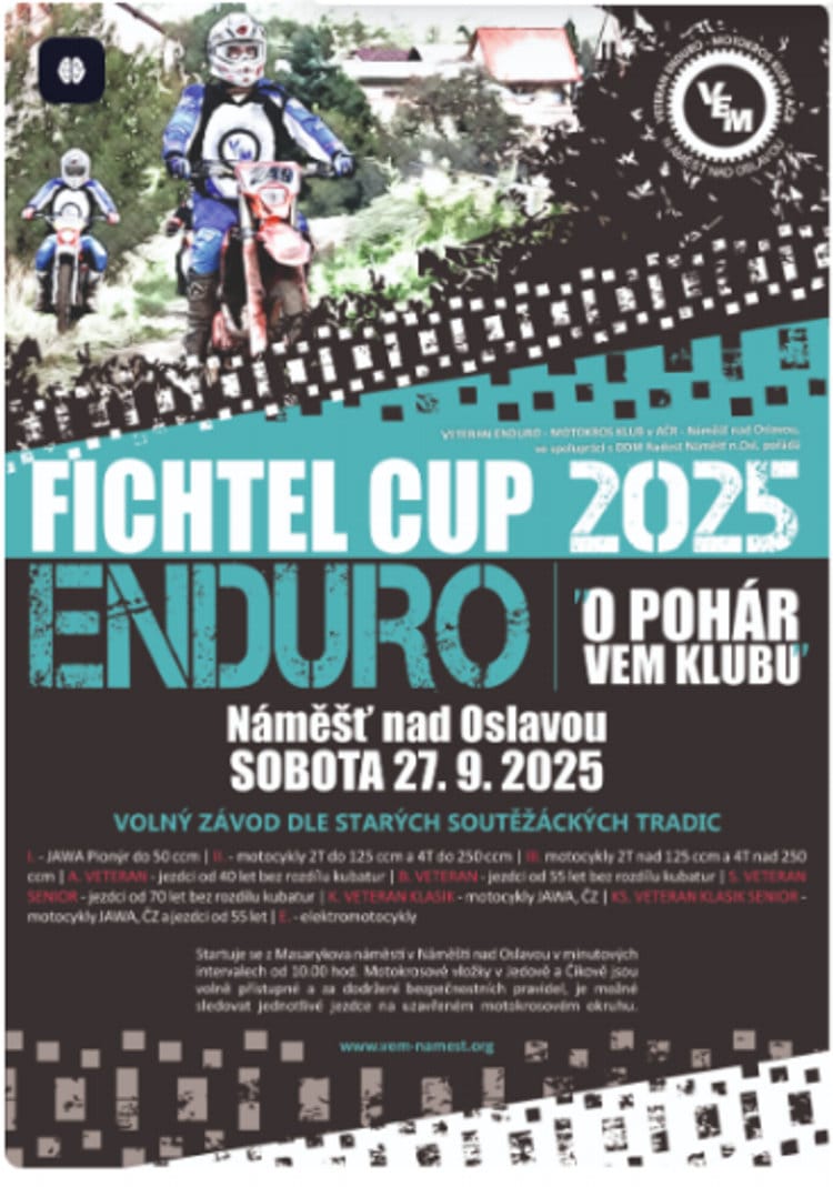 tak jako loni Veteran enduro-motokros klub v AČR ve spolupráci s Domem dětí a mládeže v Náměšti nad Oslavou pro Vás připravují v sobotu 20. září 2025 Motokros Jedovské stráně a týden na to 27. září 2025 Fichtel Cup Enduro 2025.