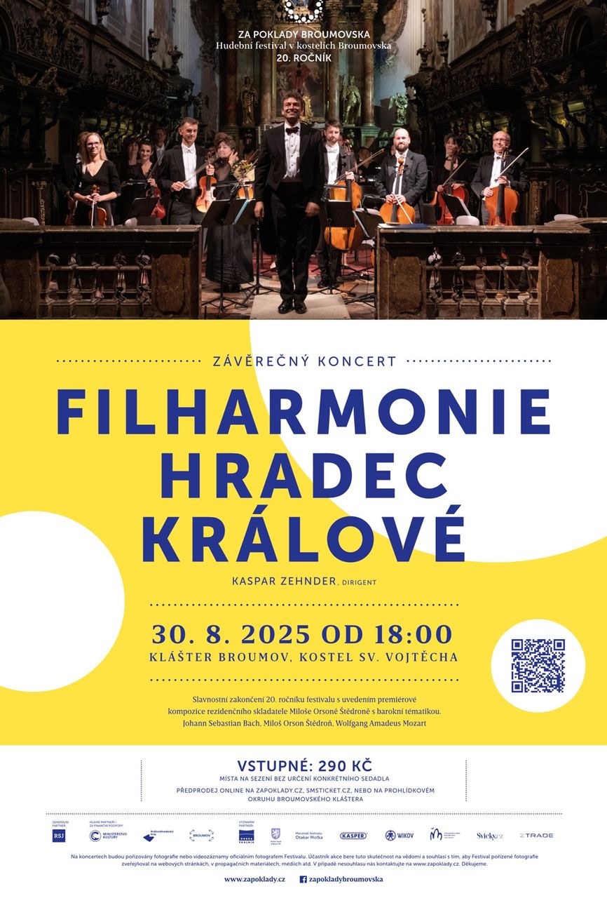 Zakončení 20. ročníku festivalu se ponese ve slavnostním duchu. Filharmonie Hradec Králové, se kterou festival Za poklady Broumovska pravidelně spolupracuje, uvede premiérovou kompozici Ouvertury rezidenčního skladatele Miloše Orsoně Štědroně s barokní tématikou. Barokní hudbou se koncert otevře a to přímo Ouverturou Johanna Sebastiana Bacha a slavnostní závěr bude patřit slavné Mozartově Pražské symfonii.