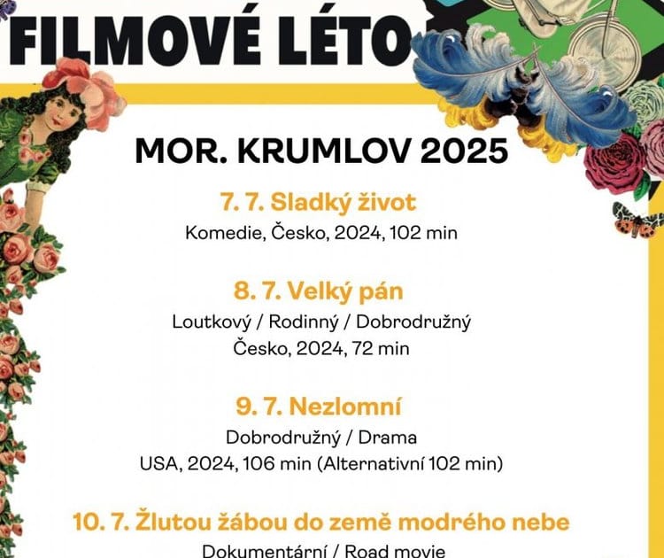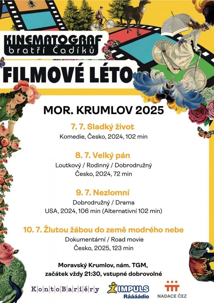 Náměstí TGM v Moravském Krumlově zve po setmění na letní filmové projekce známého Kinematografu bratří Čadíků. Začátek promítání ve 21:30 hod. Vstupné dobrovolné.