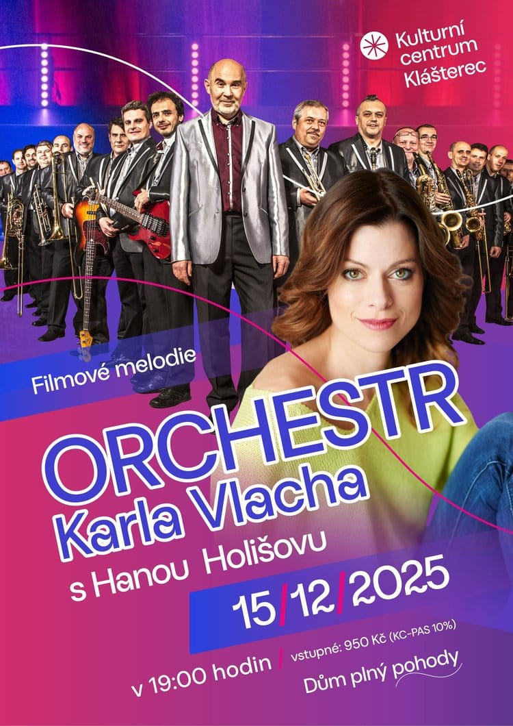Filmové melodie – Orchestr Karla Vlacha s Hanou Holišovou Kulturní centrum Klášterec nad Ohří 15. prosince 2025 | ⏰ 19:00 hodin Vstupenky: 950 Kč(Držitelé KC-PAS získávají slevu 10 %)