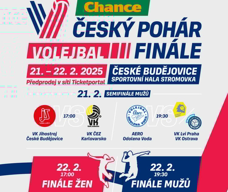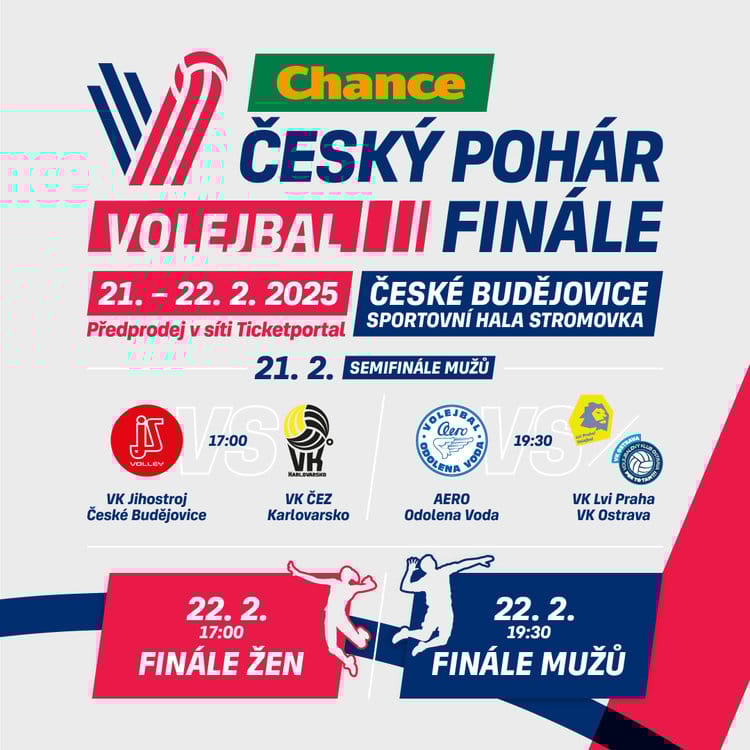 V pátek 21. února budou na programu dva semifinálové zápasy mužů. Hned v tom prvním od 17 hodin se domácí fanoušci mohou těšit na svůj tým! Úřadující extraligoví mistři VK Jihostroj České Budějovice vyzvou v souboji o finále rivala z Karlovarska, aktuálně druhý nejlepší tým ČEZ extraligy. Po skončení prvního utkání naváže druhý semifinálový duel. Jeho oficiální začátek v 19:30 je tedy pouze orientační. Soupeřem Aera Odolena Voda bude vítěz čtvrtfinálové série Lvi Praha – Ostrava, kde však již mají Pražané postup na dosah. Nové vítěze Chance Českého poháru mužů i žen se dozvíme v sobotu 22. února. Program odstartuje opět v 17 hodin finálovým utkáním žen a vyvrcholí navazujícím finále mužů, jehož začátek v 19:30 se opět může měnit v závislosti na dohrání ženského finále. Kromě nejlepšího tuzemského volejbalu se fanoušci mohou těšit na bohatý doprovodný program se soutěžemi o hodnotné ceny.