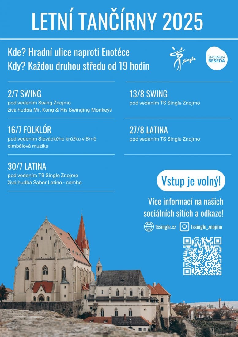 Přijďte si užít letní večer v centru Znojma v rytmu tradičních českých písní a tanců. Na tematickou tančírnu pod širým nebem u Enotéky znojemských vín zve od 19 hod. Taneční skupina Single. Na programu budou lidové tance i výuka základních kroků a zajímavých figur. Vstup je zdarma.