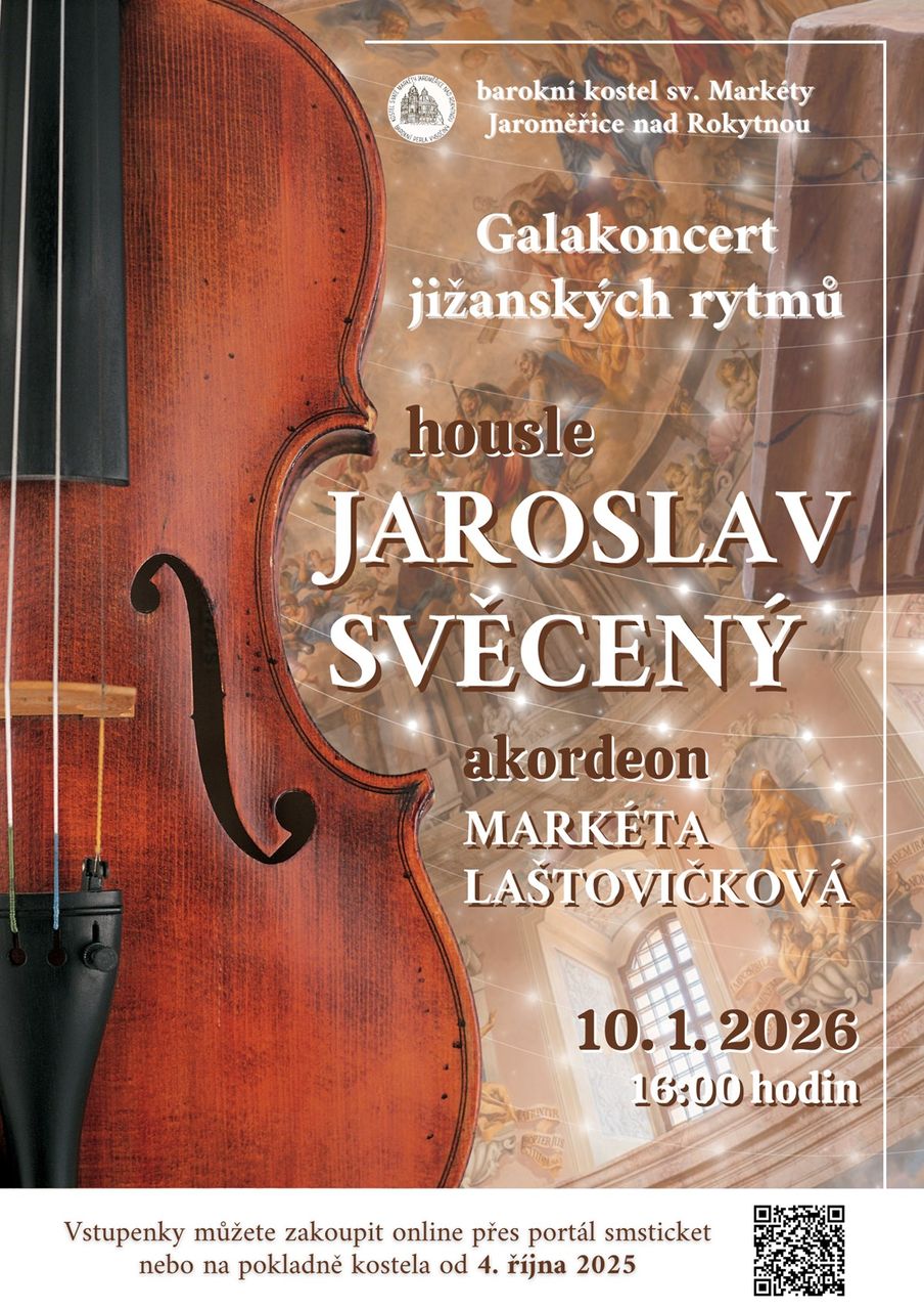 Srdečně vás zveme na galakoncert jižanských rytmů v podání houslisty JAROSLAVA SVĚCENÉHO za nevšedního doprovodu akordeonu, který rozezní MARKÉTA LAŠTOVIČKOVÁ
