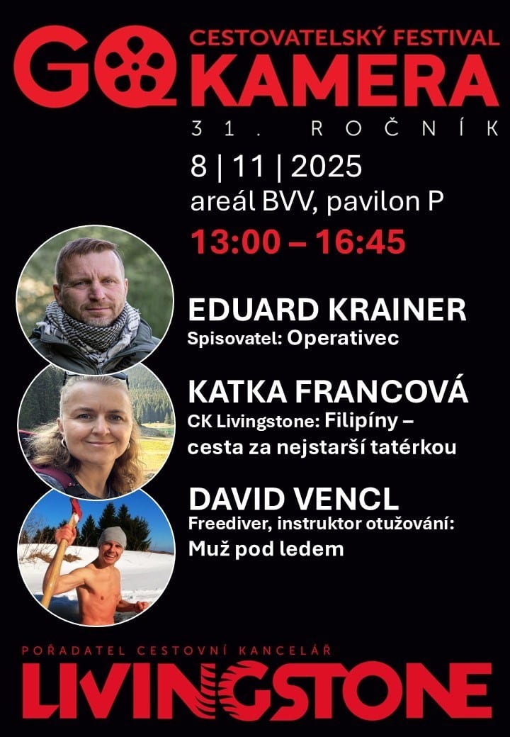 CESTOVATELSKÝ FESTIVAL GO KAMERA 8. – 11.11.2025 pořádá CK LIVINGSTONE. O nejlepší filmy, fotografie a zážitky z cest se dělí významné osobnosti rozmanitých oborů. Máte jedinečnou možnost setkat se známými cestovateli, dobrodruhy, horolezci, fotografy, lékaři nebo publicisty. www.gokamera.cz