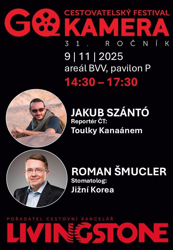 CESTOVATELSKÝ FESTIVAL GO KAMERA 8.11.- 11.11.2025 pořádá CK LIVINGSTONE. O nejlepší filmy, fotografie a zážitky z cest se dělí významné osobnosti rozmanitých oborů. Máte jedinečnou možnost setkat se známými cestovateli, dobrodruhy, horolezci, fotografy, lékaři nebo publicisty. www.gokamera.cz