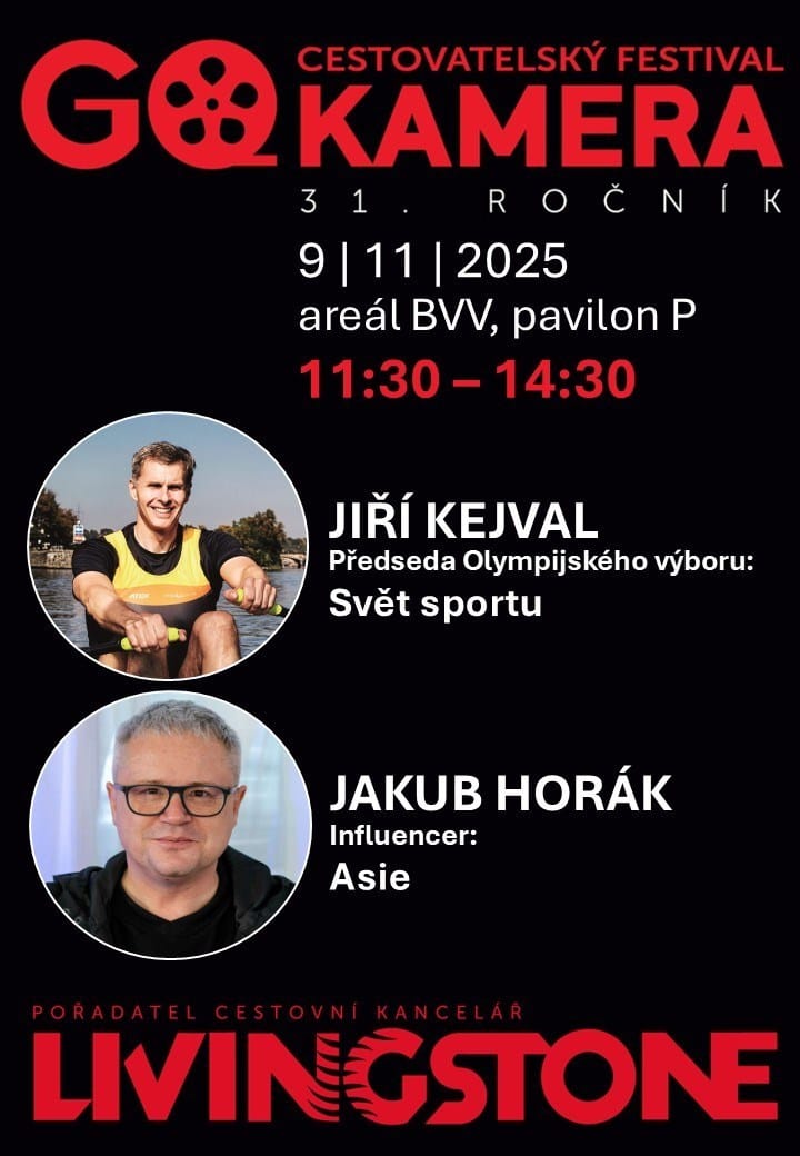 CESTOVATELSKÝ FESTIVAL GO KAMERA 8.- 11.11.2025 pořádá CK LIVINGSTONE. O nejlepší filmy, fotografie a zážitky z cest se dělí významné osobnosti rozmanitých oborů. Máte jedinečnou možnost setkat se známými cestovateli, dobrodruhy, horolezci, fotografy, lékaři nebo publicisty. www.gokamera.cz