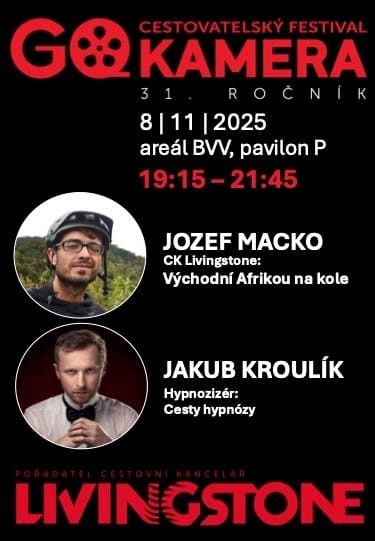 CESTOVATELSKÝ FESTIVAL GO KAMERA 8.- 11.11.2025 pořádá CK LIVINGSTONE. O nejlepší filmy, fotografie a zážitky z cest se dělí významné osobnosti rozmanitých oborů. Máte jedinečnou možnost setkat se známými cestovateli, dobrodruhy, horolezci, fotografy, lékaři nebo publicisty.