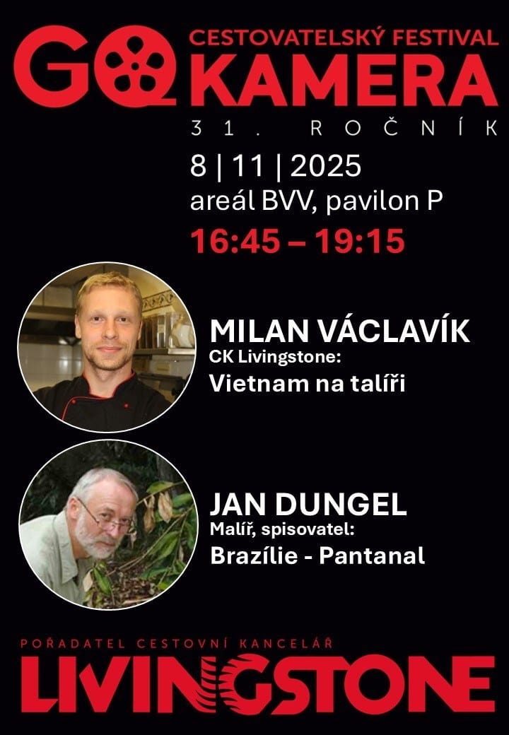 CESTOVATELSKÝ FESTIVAL GO KAMERA 8.11.- 11.11.2025 pořádá CK LIVINGSTONE. O nejlepší filmy, fotografie a zážitky z cest se dělí významné osobnosti rozmanitých oborů. Máte jedinečnou možnost setkat se známými cestovateli, dobrodruhy, horolezci, fotografy, lékaři nebo publicisty. www.gokamera.cz