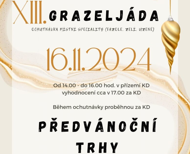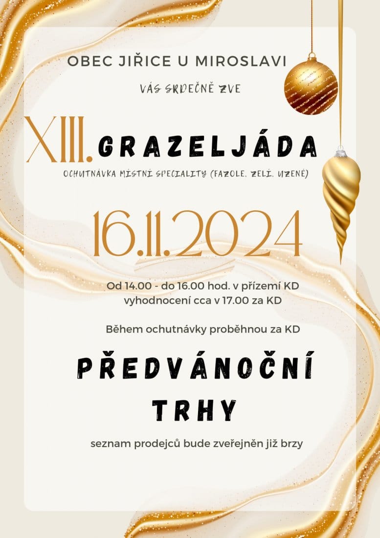 Obec Jiřice u Miroslavi srdečně zve na už XIII. ročník gastronomické soutěže „Grazeljáda“ spojené s předvánočními trhy od 14 hod. ve zdejším kulturním domě. Grazeljáda je místní specialita kombinující fazole, zelí a uzené, pojmenovaná po známém loupežníkovi a vrahovi Graselovi, který na přelomu 18. a 19. století působil na pomezí jižní Moravy, jižních Čech a dolního Rakouska. Do soutěže o nejlepší grazeljádu se může přihlásit každý, a o vítězi rozhodne ochutnávající veřejnost. Slavnostní vyhodnocení pak proběhne v 17 hod.