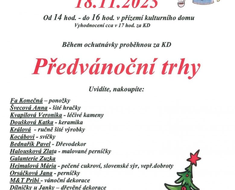 Během ochutnávky proběhnou za kulturním domem Předvánoční trhy, kde si můžete nakoupit vánoční dárky a dekorace, svíčky a svícny, keramiku, léčivé kameny, dřevěné výrobky, sýry, perníčky anebo textilní výrobky a šité hračky.