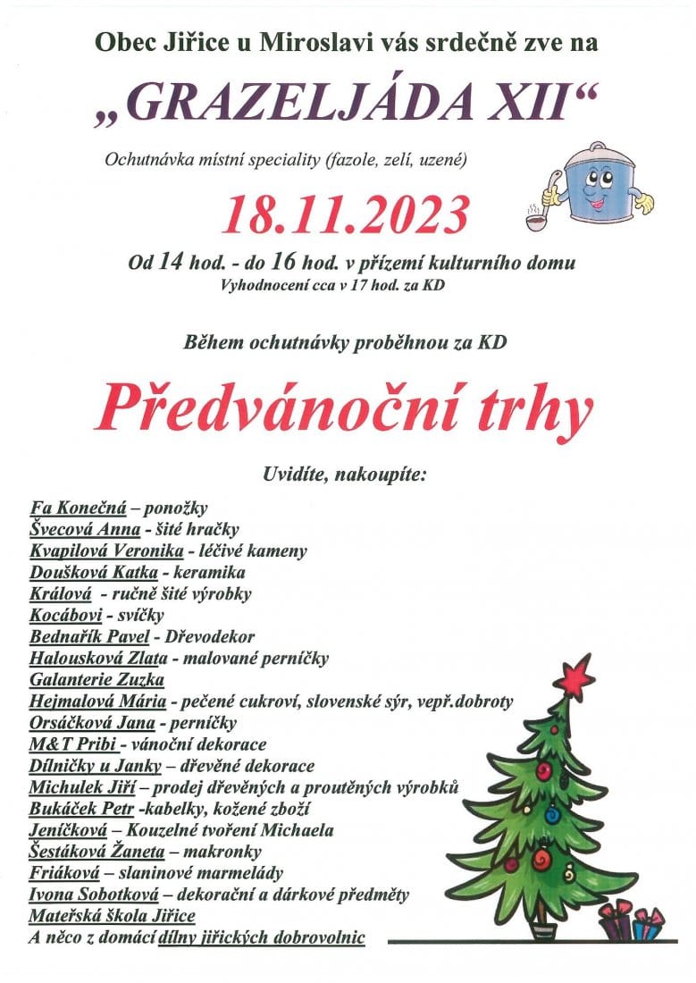 Obec Jiřice u Miroslavi srdečně zve na už XII. ročník gastronomické soutěže „Grazeljáda“ spojené s předvánočními trhy od 14 hod. ve zdejším kulturním domě. Grazeljáda je místní specialita kombinující fazole, zelí a uzené, pojmenovaná po známém loupežníkovi a vrahovi Graselovi, který na přelomu 18. a 19. století působil na pomezí jižní Moravy, jižních Čech a Rakouska. Do soutěže o nejlepší grazeljádu se může přihlásit každý a o vítězi rozhodne ochutnávající veřejnost. Slavnostní vyhodnocení pak proběhne v 17 hod.