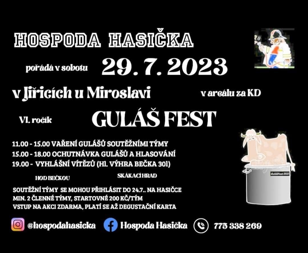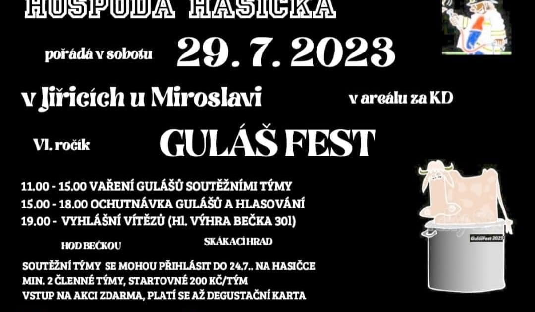 Za Kulturním domem v Jiřicích se tradičně poslední červencovou sobotu rozvoní už před polednem guláše všech druhů a chutí. Na dalším ročníku soutěžního klání o nejlepší guláš uvařený v kotlíku se utká více než 10 týmů. Veřejné ochutnávky a hlasování pak proběhnou v odpoledních hodinách. Během ochutnávky je připraven další doprovodný program pro děti a soutěž pro dospělé v hodu pivním sudem (kategorie muži, ženy) o hodnotné ceny. Večer se pak těšte na vyhlášení vítězů.