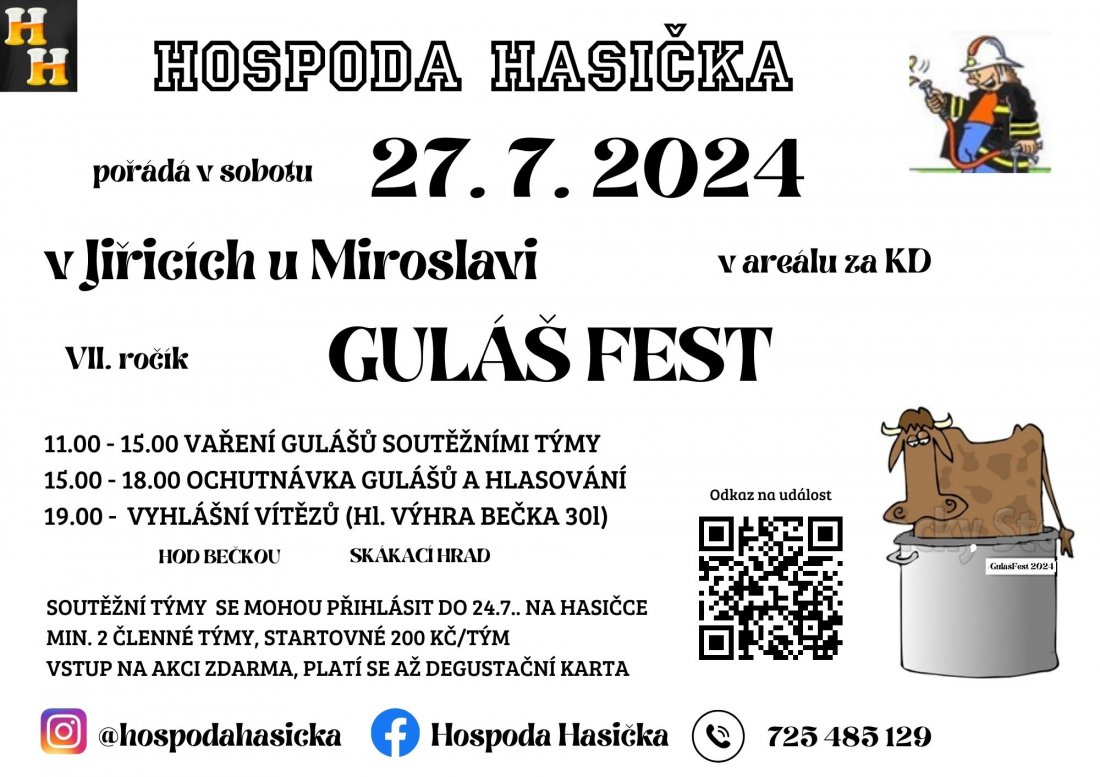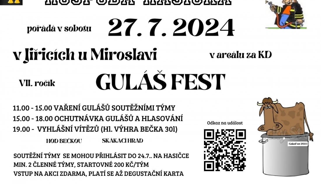 Za Kulturním domem v Jiřicích se tradičně poslední červencovou sobotu rozvoní už před polednem guláše všech druhů a chutí. Na dalším ročníku soutěžního klání o nejlepší guláš uvařený v kotlíku se utká více než 10 týmů. Veřejné ochutnávky a hlasování pak proběhnou v odpoledních hodinách. Během ochutnávky je připraven další doprovodný program pro děti a soutěž pro dospělé v hodu pivním sudem (kategorie muži, ženy) o hodnotné ceny. Večer se pak těšte na vyhlášení vítězů.