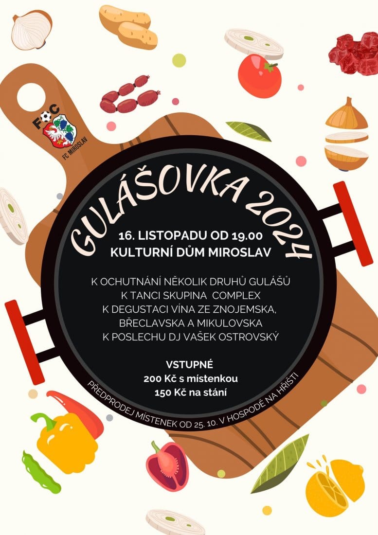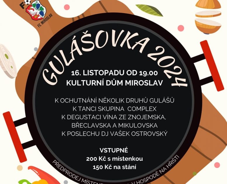 Oblíbená gastronomicko-společenská akce „Gulášová zábava“ se i letos uskuteční v Kulturním domě Miroslav s živou muzikou k tanci i poslechu, ale i s gastronomickým programem. Připravena bude soutěžní ochutnávka nejrůznějších druhů gulášů, kde porotcem bude samotná veřejnost – každý návštěvník akce dá hlas svému favoritovi. Soutěžit se bude o hodnotné ceny a vyhlášení proběhne během večera. Pro ty, co rádi soutěží, bude připravena i bohatá tombola. K dispozici bude také samostatný bar s míchanými nápoji a v salónku již tradiční ochutnávka vín ze Znojemska, Mikulovska i Břeclavska.