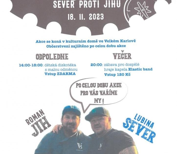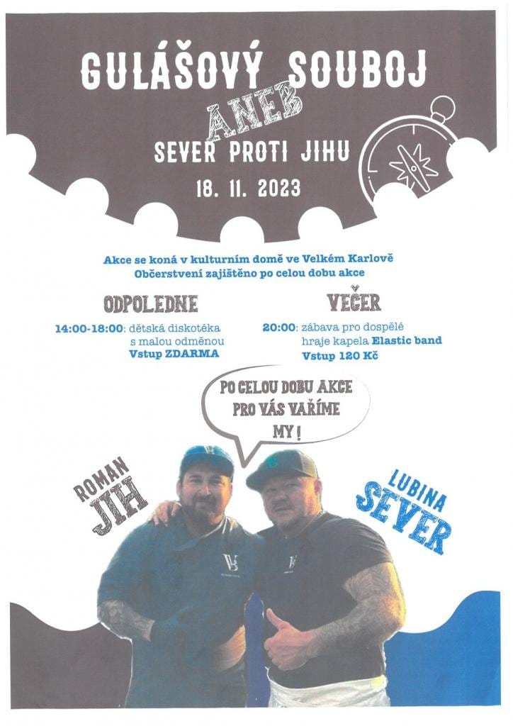 Kulturní dům ve Velkém Karlově zažije souboj gulášů ve stylu Severu proti Jihu. Odpoledne se těšte na program pro děti s dětskou diskotékou, kterou pak večer vystřídá taneční zábava pro dospělé s kapelou Elastic Band.
