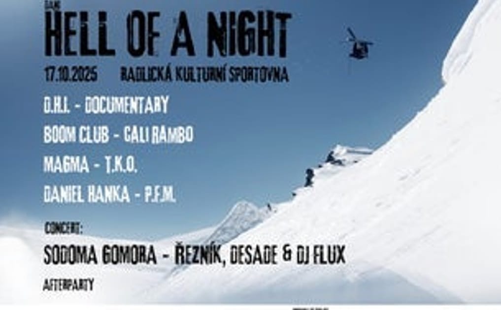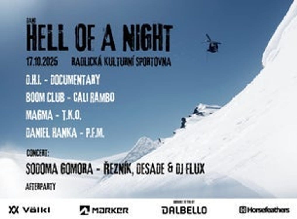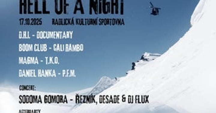 Nejlepší mejdan podzimu je tady!!! Přijďte si užít HELL OF A NIGHT – to nejlepší, co domácí a světový freeskiing nabízí. Naladíme se na zimní atmosféru a ukážeme, že komunita kolem zimních sportů v ČR je pořád silná a umí za to pořádně vzít!