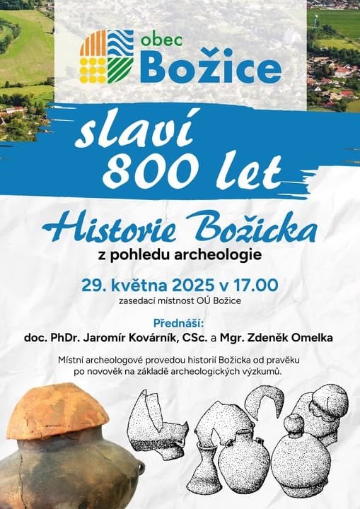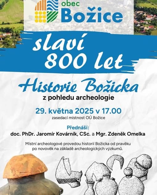 Obec Božice letos slaví 800 let od svého založení. K této příležitosti pořádá obec přednášku věnovanou tématu archeologie a archeologických nálezů v okolí Božic. Přednáška je zaměřená na historii od pravěku až po novověk a bude se konat od 17 hod. v zasedací místnosti Obecního úřadu v Božicích. Přednášku povedou odborníci doc. PhDr. Jaromír Kovárník, CSc. a Mgr. Zdeněk Omelka.