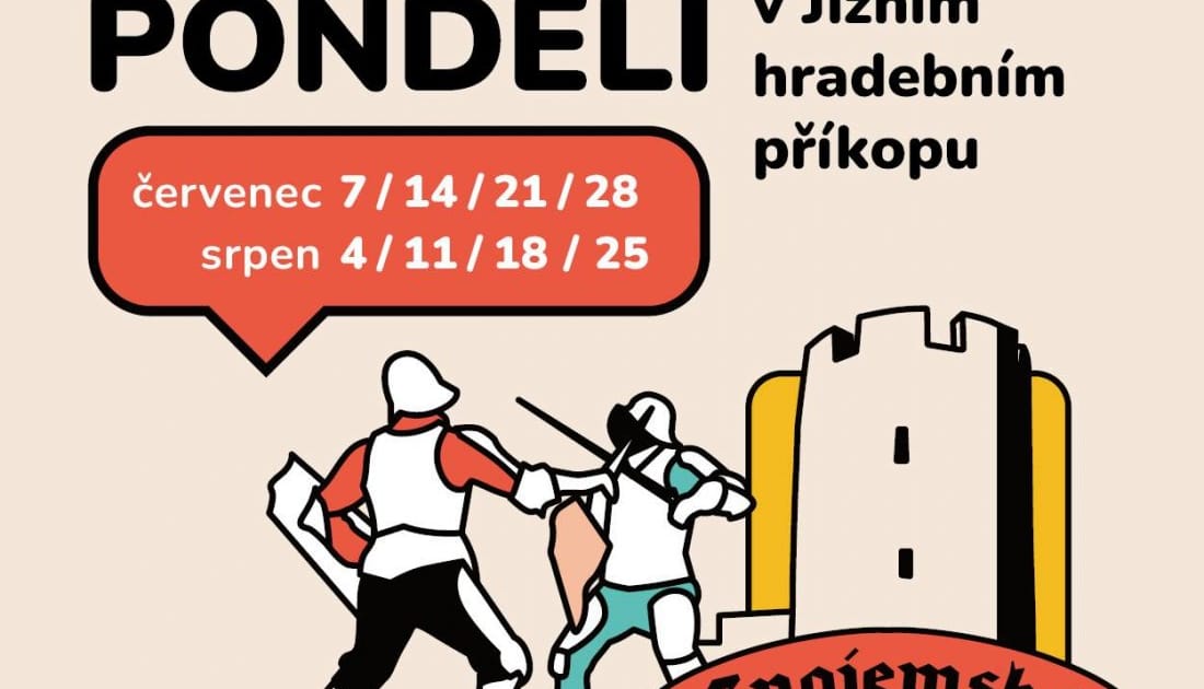 Pondělí je obvykle dnem, kdy mají památky v ČR obvykle zavřeno. Ve Znojmě se však právě první den v týdnu nabízí po celé prázdniny zejména rodinám s dětmi zábavný program v Jižním hradebním příkopu za Vlkovou věží. Od 10 do 12:30 hod. tu můžete zažít kejklířská a pohádková vystoupení pro děti, sokolnické ukázky letu dravých ptáků anebo si vyzkoušet jízdu na ponících a střelbu z luku. Od 16 do 20 hod. sem lákají šermíři na své vojenské ležení, ukázky zbraní a zbrojí i na rytířské souboje.  Od 17:30 je pak pro návštěvníky připraveno ještě jedno sokolnické představení. Vstup je vždy zdarma.