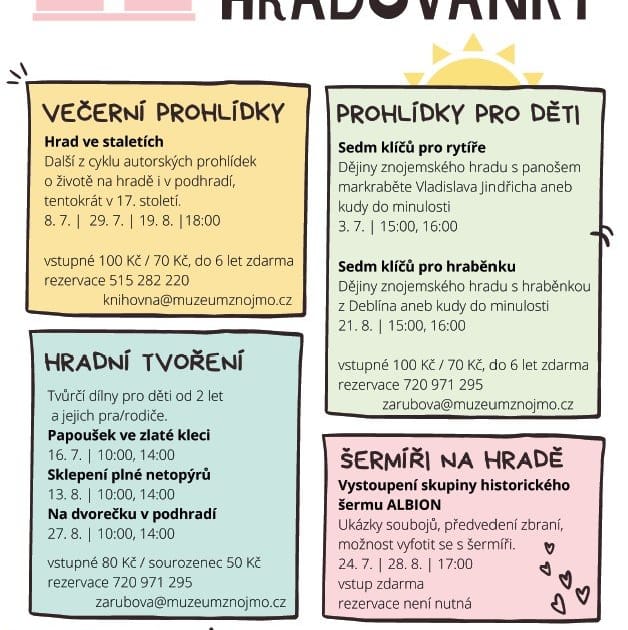 V rámci prázdninového programu „Letní hradovánky“ pořádá i letos Jihomoravské muzeum ve Znojmě na Znojemském hradě speciální tvůrčí dílničky pro děti od 2 let a jejich pra/rodiče. Ve středu 27. srpna se zaměří na venkovní prostředí. Hradní tvoření začíná v 10 nebo ve 14 hod. Doporučujeme rezervaci předem!