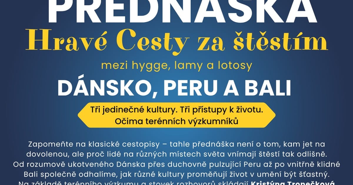 Tahle přednáška není o tom, kam jet na dovolenou, ale proč lidé po světě vnímají štěstí tak odlišně. Od dánského hygge přes peruánské hory až po balijskou harmonii se vydáme hledat, jak různé kultury proměňují život v umění být šťastný.