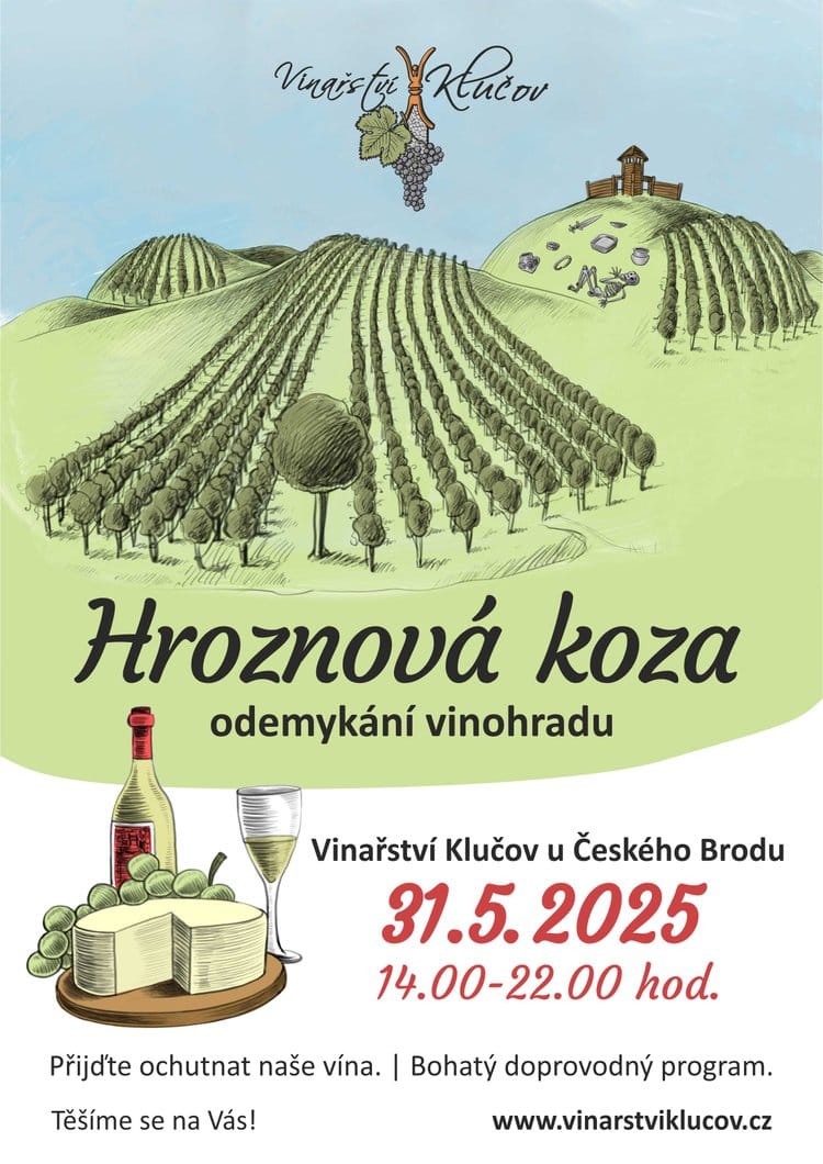 V sobotu 31.5. se ve vinařství Klučov u Českého Brodu rozezní cimbálová muzika, my oblečeme polabské kroje a vyneseme hroznovou kozu do vinice. Tento znojemský zvyk jsme si dovezli sem k nám do Polabí.