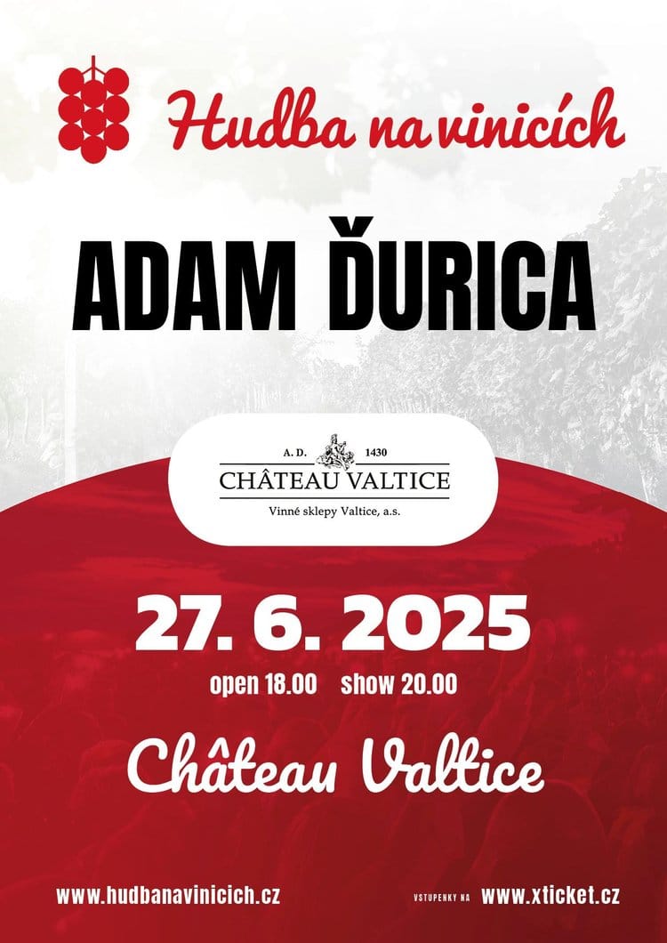 Projekt Hudba na vinicích propojuje skvělou muziku se skvělým vínem, to vše v nádherných lokalitách českých a moravských vinařství. Těšte se na večerní koncert slovenského zpěváka Adama Ďurici v areálu vinařství, ochutnávku vín CHÂTEAU VALTICE a VINAŘSTVÍ KOVACS a nebudou chybět ani další dobroty k zakousnutí. Koncert je na stání, ve venkovním areálu vinařství. Otevření areálu od 18.00 hod., začátek koncertu ve 20.00 hod.