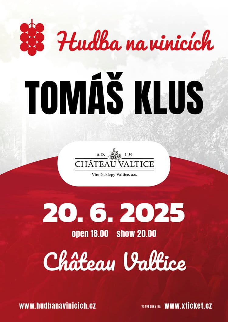 Projekt Hudba na vinicích propojuje skvělou muziku se skvělým vínem, to vše v nádherných lokalitách českých a moravských vinařství. Těšte se na večerní koncert zpěváka Tomáše Kluse v areálu vinařství, ochutnávku vín CHÂTEAU VALTICE a VINAŘSTVÍ KOVACS a nebudou chybět ani další dobroty k zakousnutí. Koncert je na stání, ve venkovním areálu vinařství. Otevření areálu od 18.00 hod., začátek koncertu ve 20.00 hod.