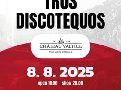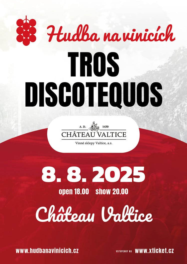 Projekt Hudba na vinicích propojuje skvělou muziku se skvělým vínem, to vše v nádherných lokalitách českých a moravských vinařství. Těšte se na večerní koncert kapely Tros Discotequos – sestávající z Vojty Dyka, Jakuba Prachaře a Jana Maxiána v areálu vinařství, ochutnávku vín CHÂTEAU VALTICE a VINAŘSTVÍ KOVACS a nebudou chybět ani další dobroty k zakousnutí. Koncert je na stání, ve venkovním areálu vinařství. Otevření areálu od 18.00 hod., začátek koncertu ve 20.00 hod.