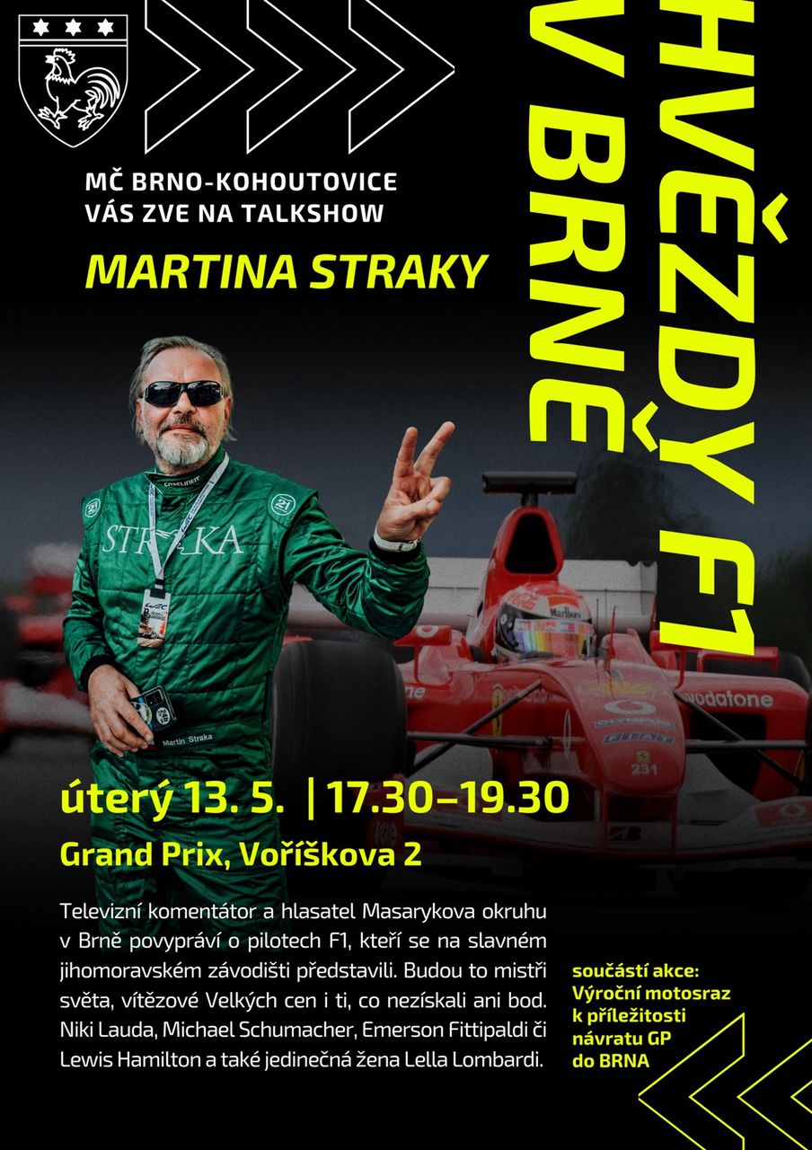 Martin Straka, televizní komentátor a hlasatel Masarykova okruhu v Brně povypráví o pilotech F1, kteří se na slavném jihomoravském závodišti představili. Budou to mistři světa, vítězové Velkých cen i ti, co nezískali ani bod. Niki Lauda, Michael Schumacher, Emerson Fittipaldi či Lewis Hamilton a také jedinečná žena Lella Lombardi.
