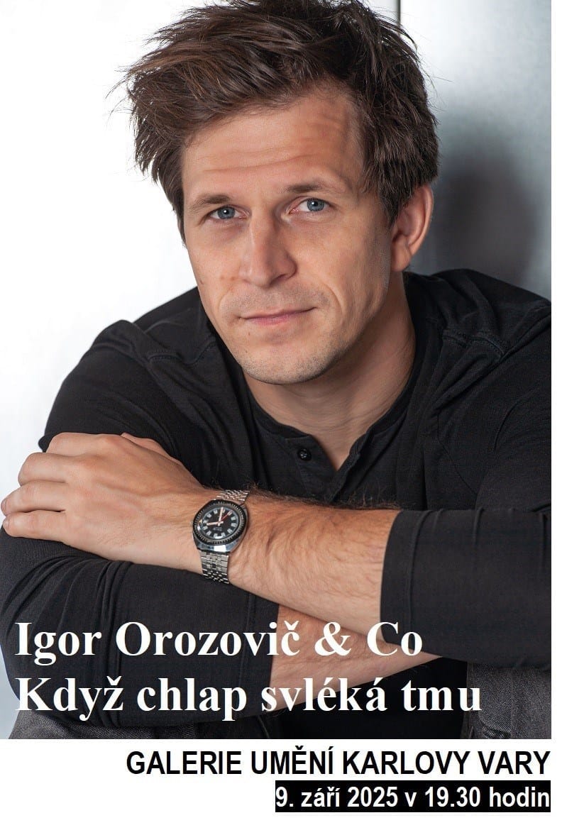 Do karlovarské galerie umění zavítá muž mnoha talentů Igor Orozovič (1984), herec, zpěvák, pianista, autor scénické hudby, ale i koláží a linorytů, milovník retra a gramofonových desek, obdivovatel češtiny a šansonů. Absolvent herectví na DAMU, od roku 2013 člen činohry Národního divadla v Praze, spoluzakladatel Cabaretu Calembour, rozvíjejícího poetiku divadel malých forem. A od roku 2022 také úspěšný sólový muzikant s autorským repertoárem, který odstartovala skladba Hippokratova armáda, vzdávající hold zdravotníkům v době covidu, a potvrdilo první autorské album nazvané „Když chlap svléká tmu“ nominované na cenu Anděl 2024 v kategorii sólový interpret. Igor Orozovič zhudebňuje kvalitní poezii různých autorů, ale také sám texty plné emocí, romantiky, nadhledu, humoru i temnějších stránek života píše. Šansonově laděné písně koření prvky rocku, blues a soulu, dodává jim aranžemi, výrazem (je přeci výborný herec) a temným hlasem punc osobitosti a jedinečnosti. Sám říká: „Snažím se o moderně uchopený, dobrý český song, který nepostrádá melodii, text a má nějakou členitost. Pro mě je sdělení důležité, jsem herec a mám rád češtinu. Žánr pro mě není hlavní věc. Neřeším to. V divadle také hraju v různých hrách, někdy v komedii, jindy v tragédii..“ Mix hudebních stylů i témat, doprovodná kapela (František Bořík – klávesy, Marek Novotný – kytara, a.m.almela – basa) a charismatický muzikant bezprostředně komunikující s publikem, které ho možná nejvíce zná jako televizního Poldu…to vše vás čeká v úterý 9.9.2025 od 19.30 hodin.