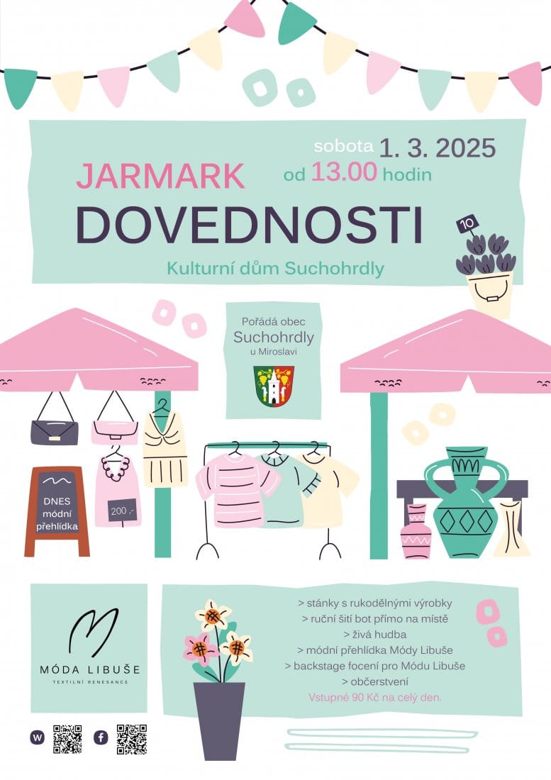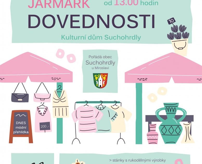 Jarní náladu přinese do kulturního domu v Suchohrdlech u Miroslavi hned první březnový den akce nazvaná Jarmark dovednosti. Těšte se na trh s rukodělnými výrobky, ruční šití bot přímo na místě, živou hudbu, módní přehlídku i fotokoutek. Připraveno bude samozřejmě také občerstvení.