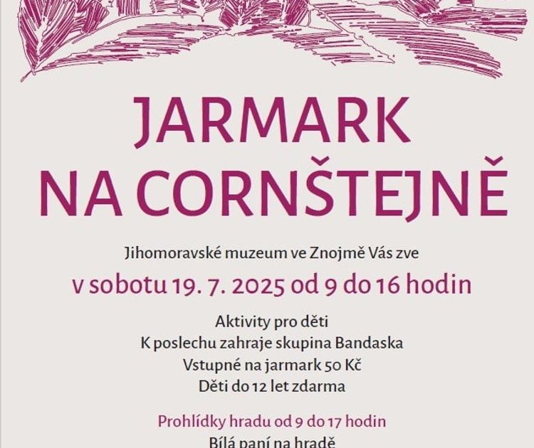 Milovníky středověku potěší celodenní jarmark s ukázkami dobových řemesel a bohatým doprovodným programem na zřícenině hradu Cornštejn nedaleko obce Bítov. Čekají Vás ukázky řemesel a řemeslných výrobků, hudební produkce, prohlídky s Bílou paní, šermířská vystoupení a další aktivity pro děti. Ochutnáte také středověké placky a kaše, domácí zavařeniny i sirupy a nakoupíte např. přírodní kosmetiku, sýry, sušené dobroty nebo domácí chléb či rukodělné výrobky.
