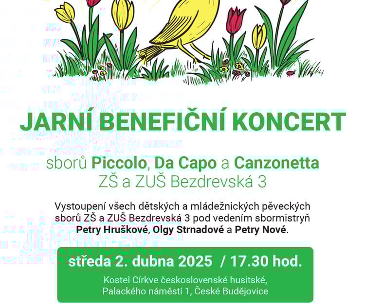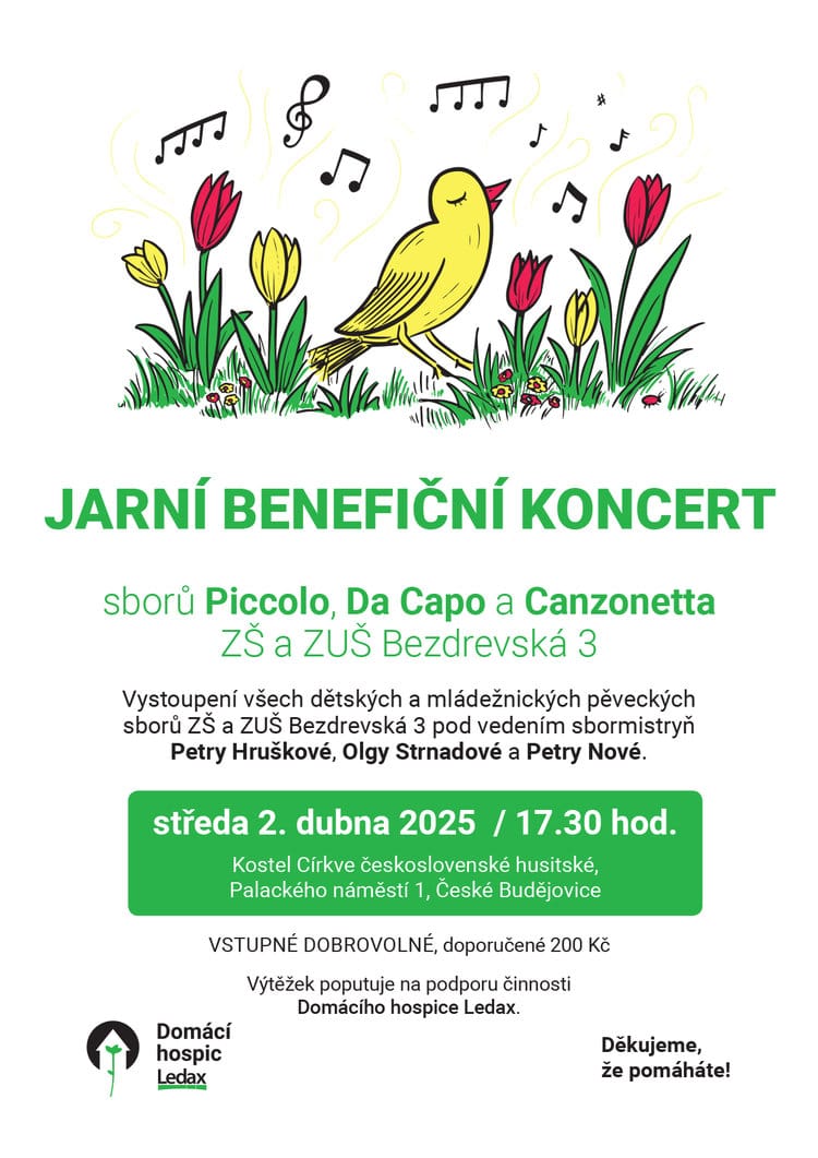 Přijďte si užít jarní koncert dětských pěveckých sborů na podporu Domácího hospice Ledax. V kostele Církve československé husitské zazpívají na podporu Domácího hospice Ledax sbory Piccolo, Da Capo a Canzonetta. Veškerý výtěžek ze vstupného putuje na podporu činnosti Domácího hospice Ledax.