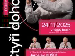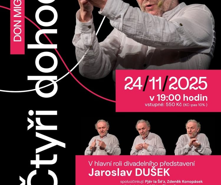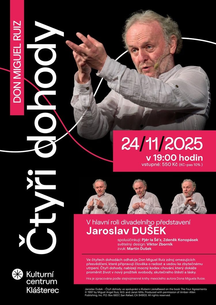 Jaroslav Dušek: Čtyři dohodyVe Jaroslav Dušek: ve čtyřech dohodách odhaluje Don Miguel Ruiz zdroj omezujících přesvědčení, která připravují člověka o radost a vedou ke zbytečnému utrpení. Čtyři dohody nabízejí mocný kódex chování, který dokáže proměnit život v nový prožitek svobody, skutečného štěstí a lásky.Hra je zpracována podle stejnojmenné knihy Dona Miguela Ruize.