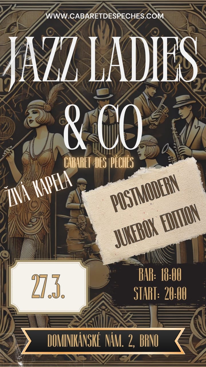 Jazz Ladies & Co vás zvou do magického prostředí Cabaretu des Péchés, kde vás čeká jedinečné vystoupení Jazz Ladies a živé jazzové kapely s repertoárem ve stylu známého Postmodern Jukebox.